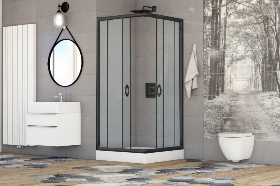 Kabina wykonana z bezpiecznego i wytrzymałego szkła hartowanego Z POWŁOKĄ EASY CLEAN, posiada czarne profile i uchwyty.