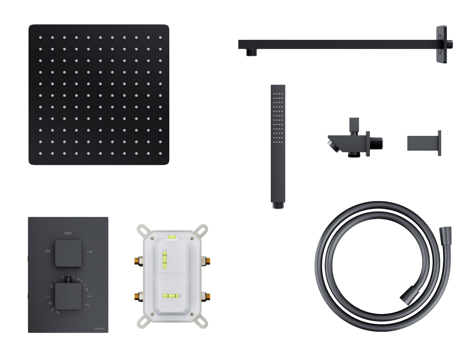 Natryskowy czarny zestaw prysznicowy Corsan ZA25TBLW kwadrat termostat i wylewka