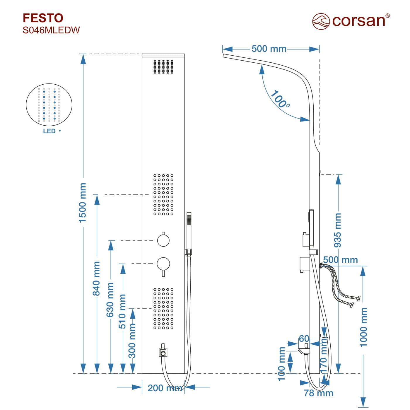 Panel prysznicowy Corsan FESTO Mieszacz Czarna stal Deszczownica LED Wylewka