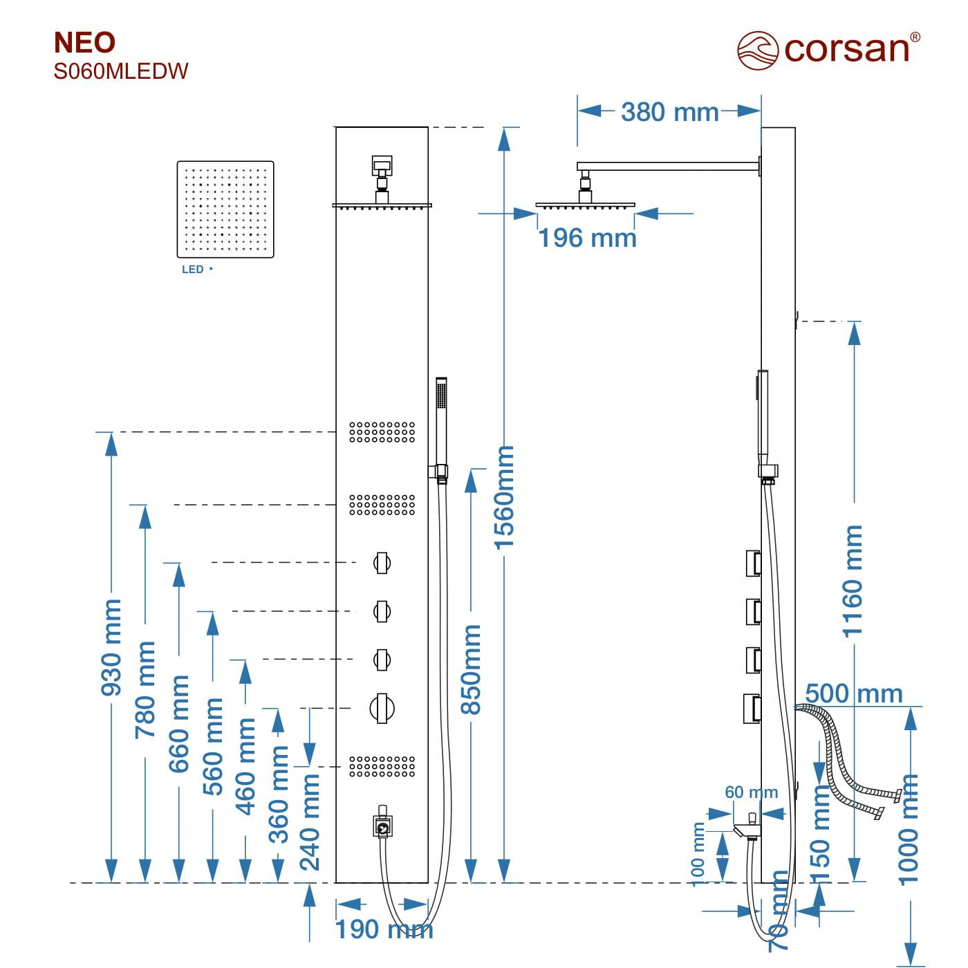 Panel prysznicowy Corsan NEO Mieszacz Czarna stal Deszczownica LED Wylewka