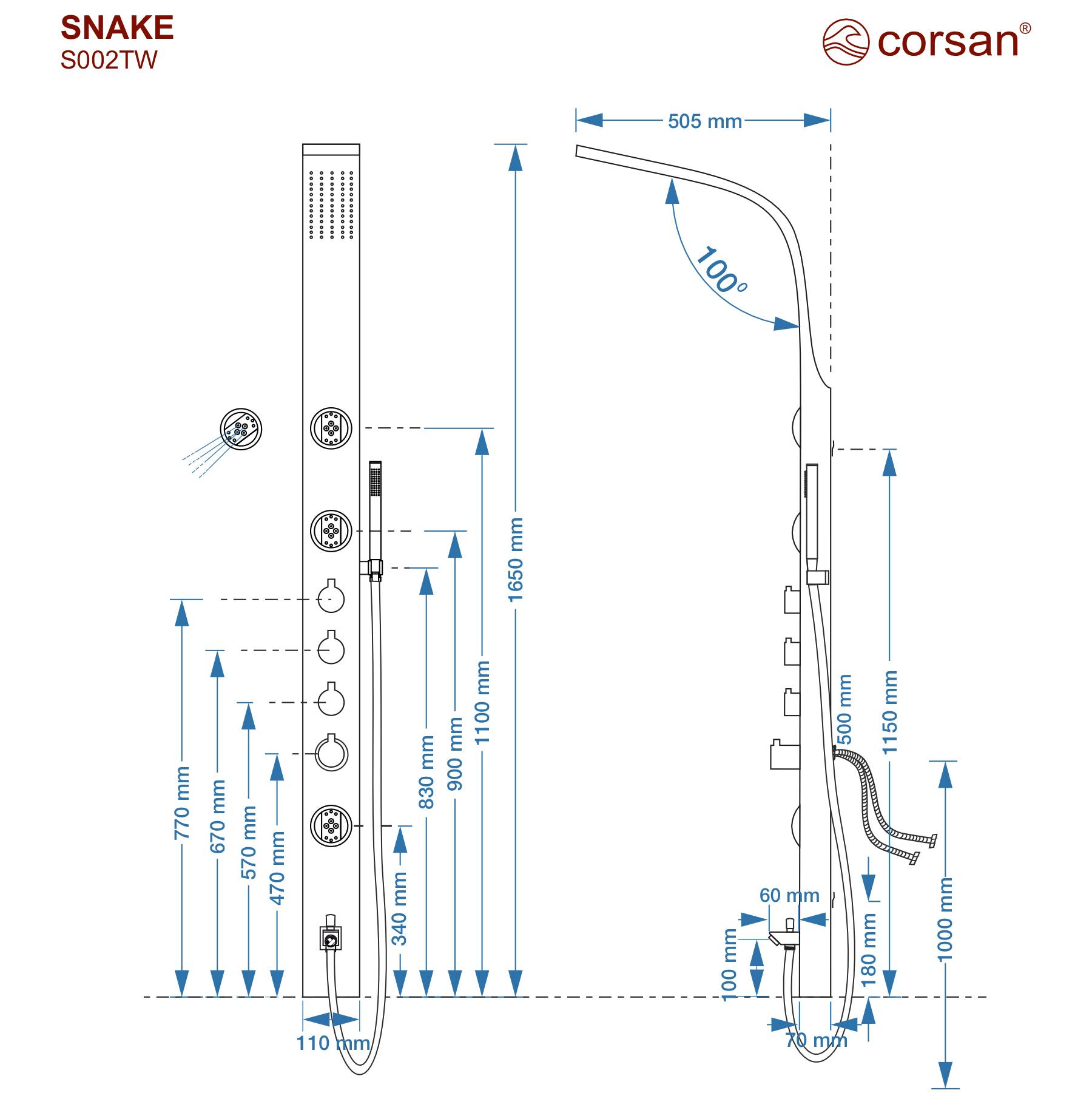 Panel prysznicowy Corsan SNAKE Termostat Czarna stal Wylewka