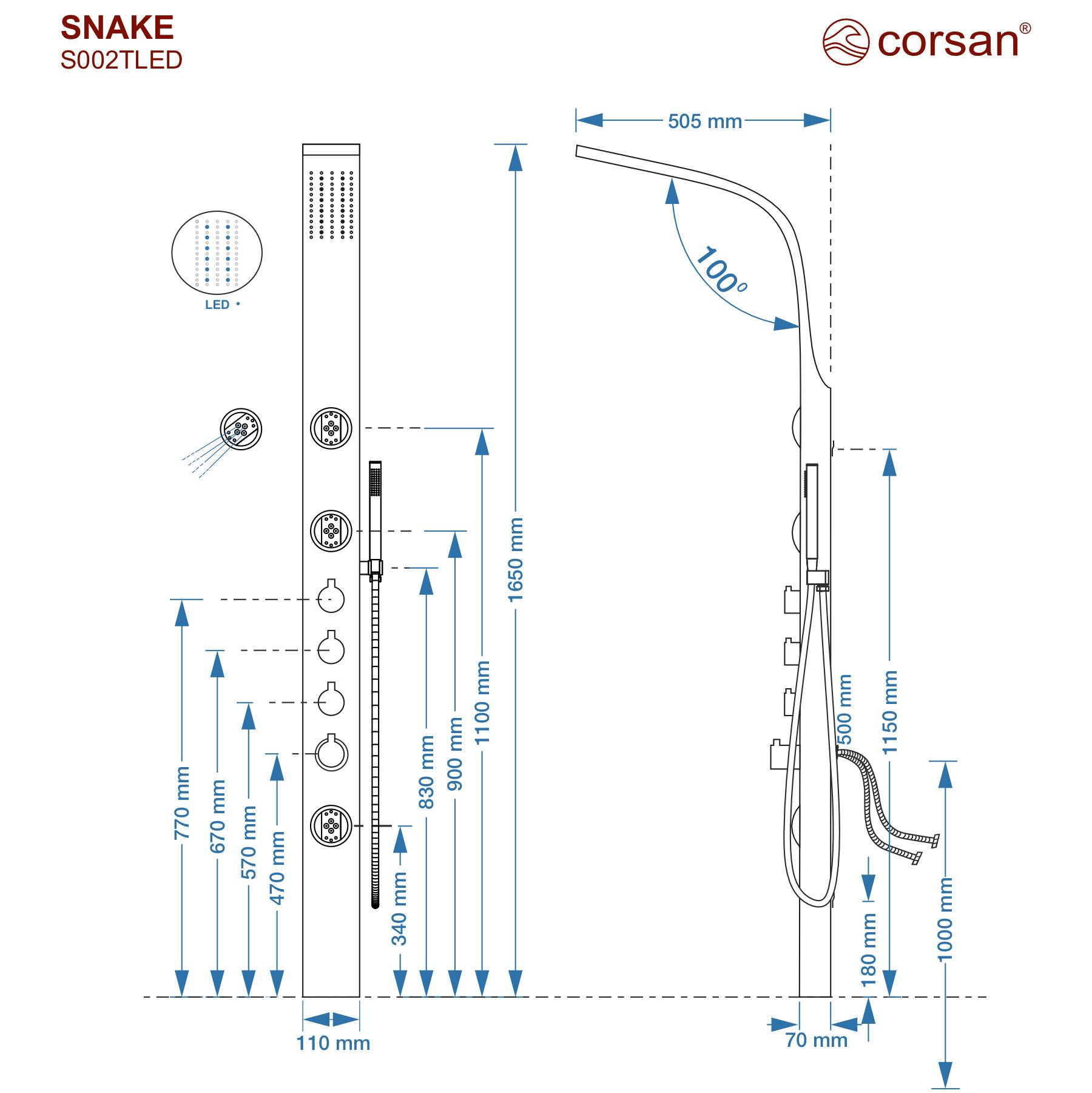Panel prysznicowy Corsan SNAKE Termostat Stal GunMetal Deszczownica LED