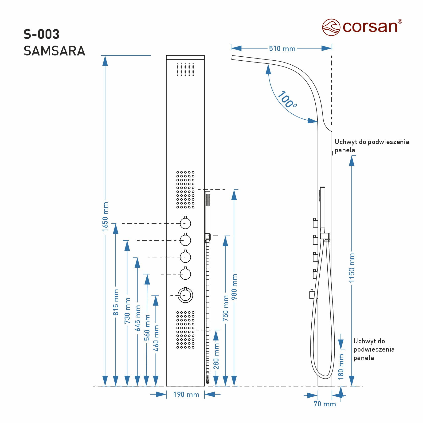 Panel prysznicowy Corsan Samsara S003 Termostat Stal szczotkowana Wylewka Deszczownica LED