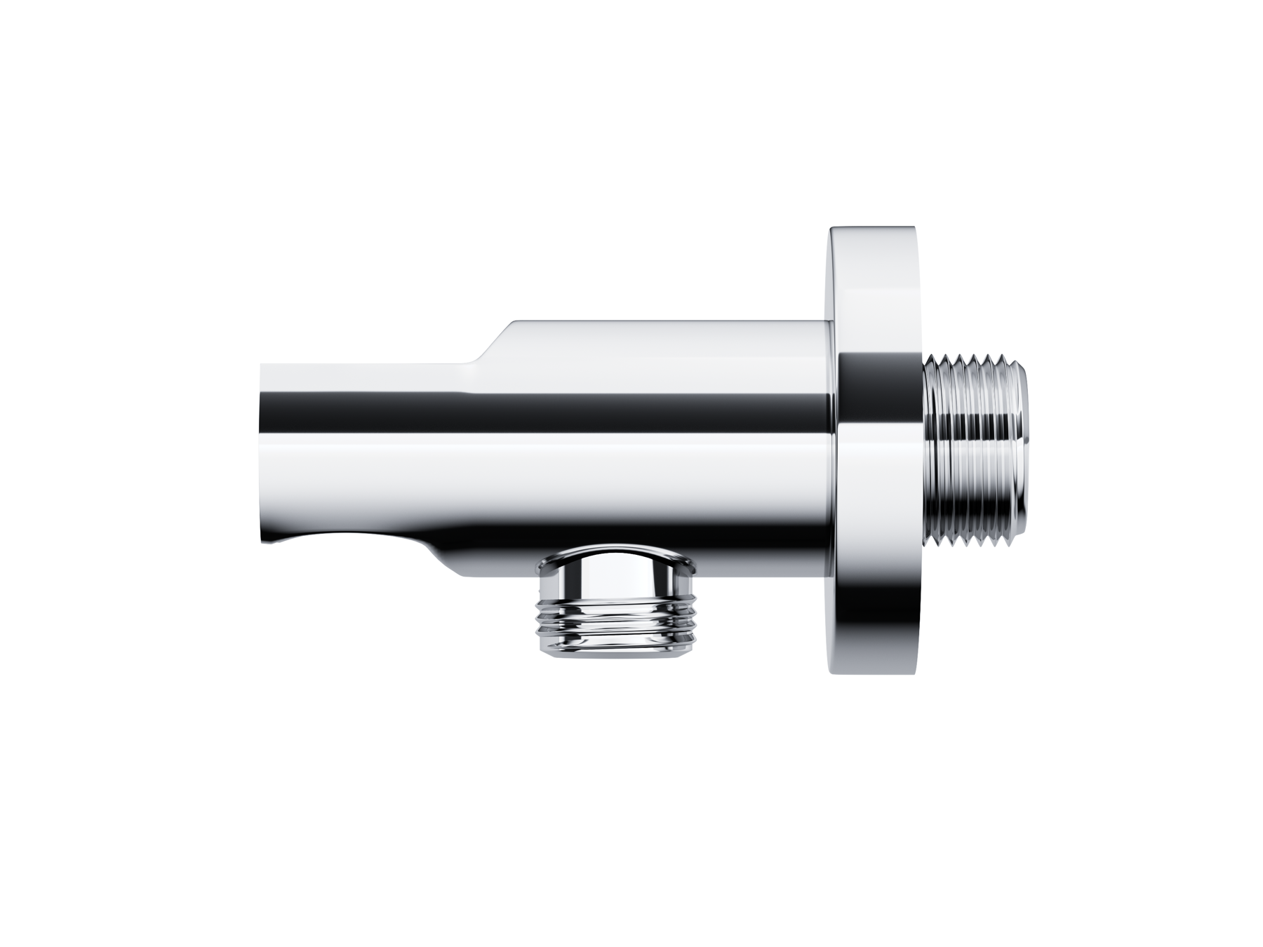 Mosiężny, chromowany uchwyt prysznica ręcznego z przyłączem do węża prysznicowego. W zestawie z uchwytem znajduje się maskownica i nakrętka ułatwiająca montaż.